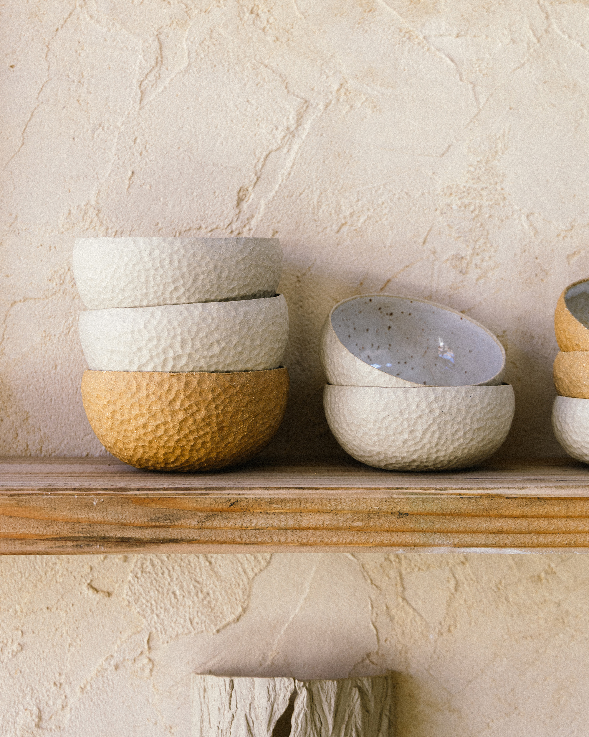 Dans sa pratique, Céline façonne à la main des grès blancs, noirs et roux. Elle aime composer des harmonies organiques entre terres lisses et chamottés, explorer les contrastes et les irrégularités.